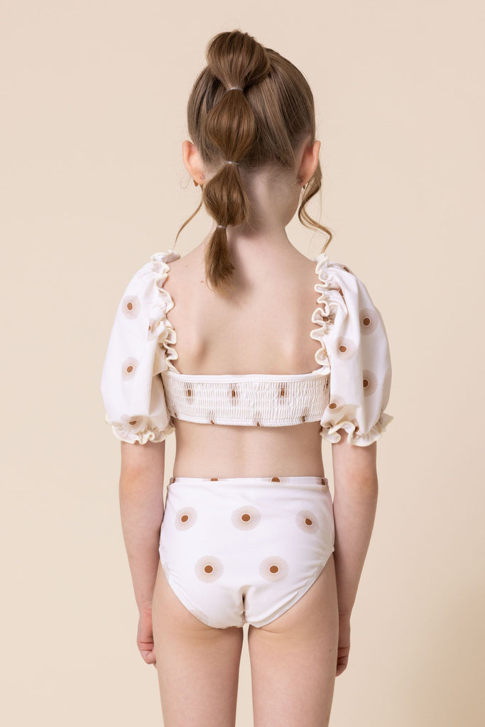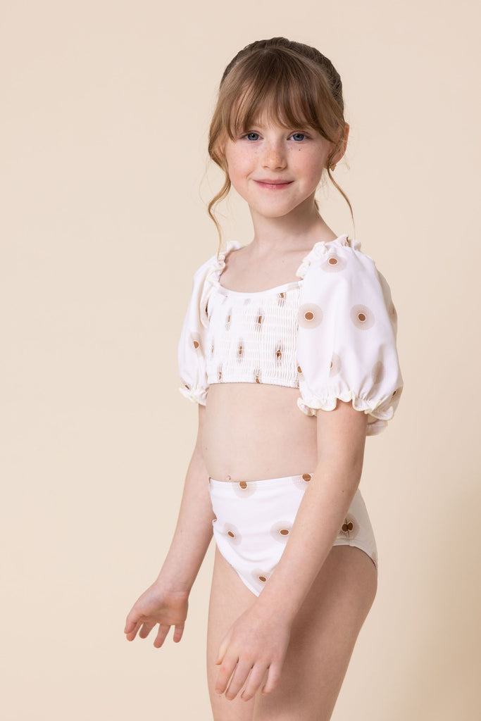 Swim in style with our Girl's Sleeved Bikini! The two-piece set features smocking on the top, puff sleeves, a square neck, and high waisted bottoms. With its UPF 50+ fabric, this suit is not only adorable but provides reliable sun protection. It's made of 87% nylon and 13% spandex for comfort and durability. Machine wash on gentle cold and lay flat to dry for easy care.